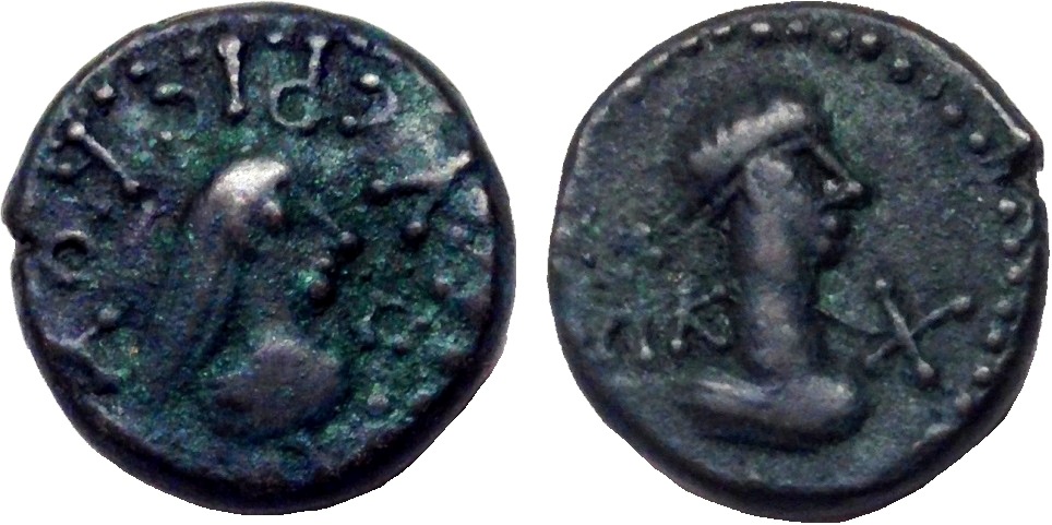 - ΒΑCΙΛΕωC ΡΗCΚΟΥΠΟΡΙC. Бюст царя вправо, справа «венок»