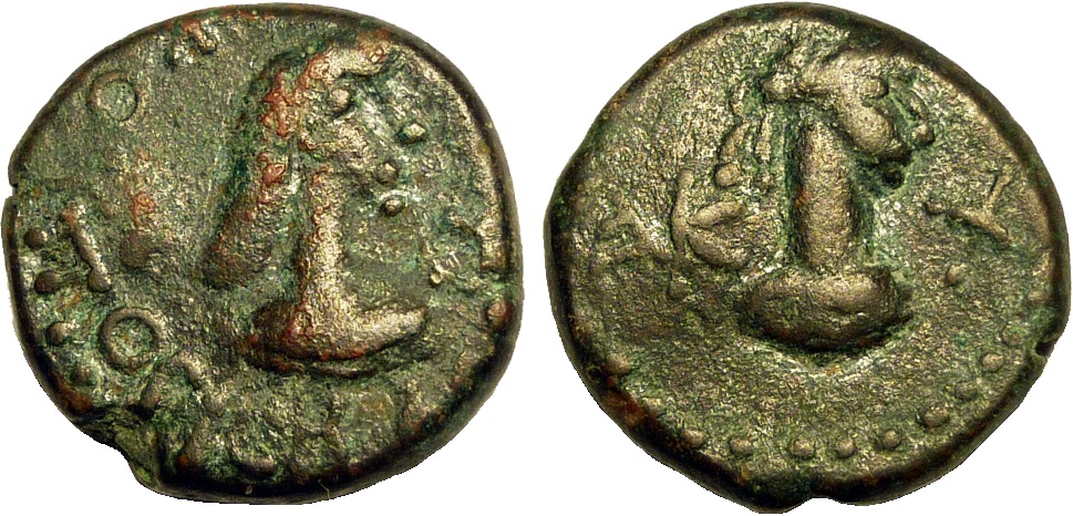 - ΒΑCΙΛΕωC ΡΗCΚΟΥΠΟΡΙC. Бюст царя вправо, справа «венок»