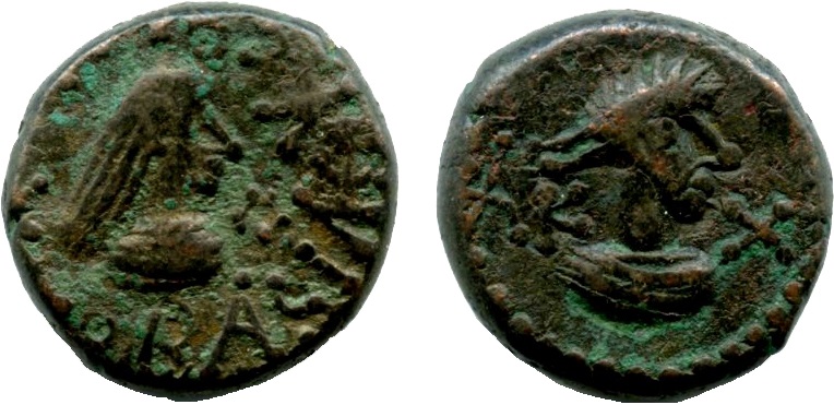 - ΒΑCΙΛΕωC ΡΗCΚΟΥΠΟΡΙC. Бюст царя вправо, справа «венок»