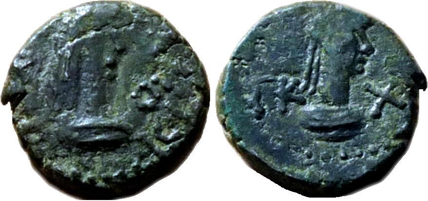 - ΒΑCΙΛΕΥC ΡΗCΚΟΥΠΟΡΙC. Бюст царя вправо, справа венок