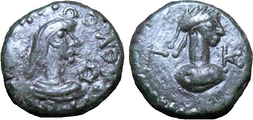 - ΒΑCΙΛΕΥC ΡΗCΚΟΥΠΟΡΙC. Бюст царя вправо, справа венок
