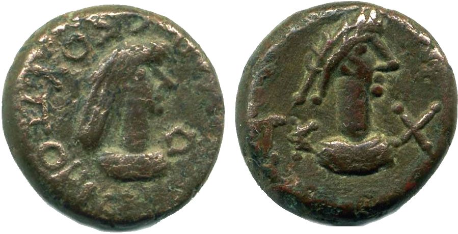 - ΒΑCΙΛΕΥC ΡΗCΚΟΥΠΟΡΙC. Бюст царя вправо, справа венок
