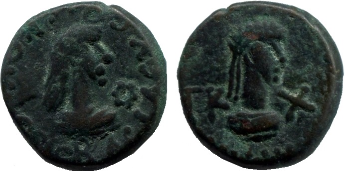 - ΒΑCΙΛΕΥC ΡΗCΚΟΥΠΟΡΙC. Бюст царя вправо, справа венок