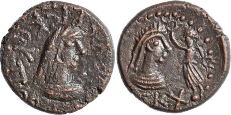 Бюст императора вправо, внизу год ГKX (623 г. б. э.), справа Нике на шаре с венком в руке
