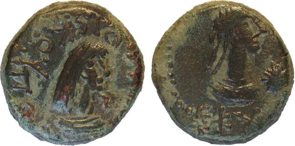 ΒΑCΙΛΕωC ΡΗCΚΟΥΠΟΡΙC. Бюст царя вправо, справа «венок»